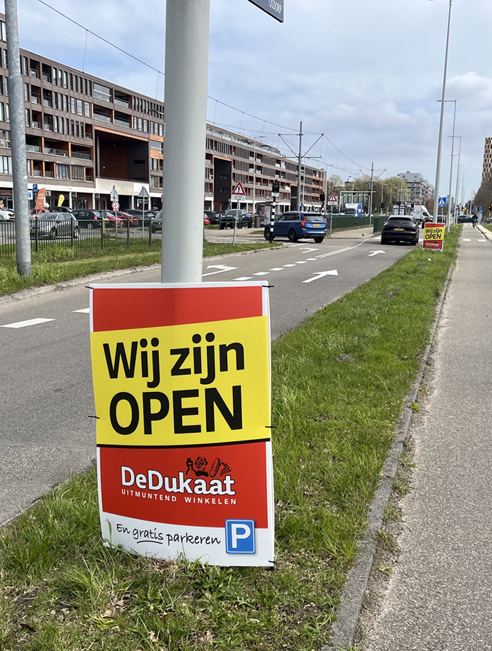 A0 signing voor shopping mall (steiger verhinderen zichtbaarheid). april 2026.
