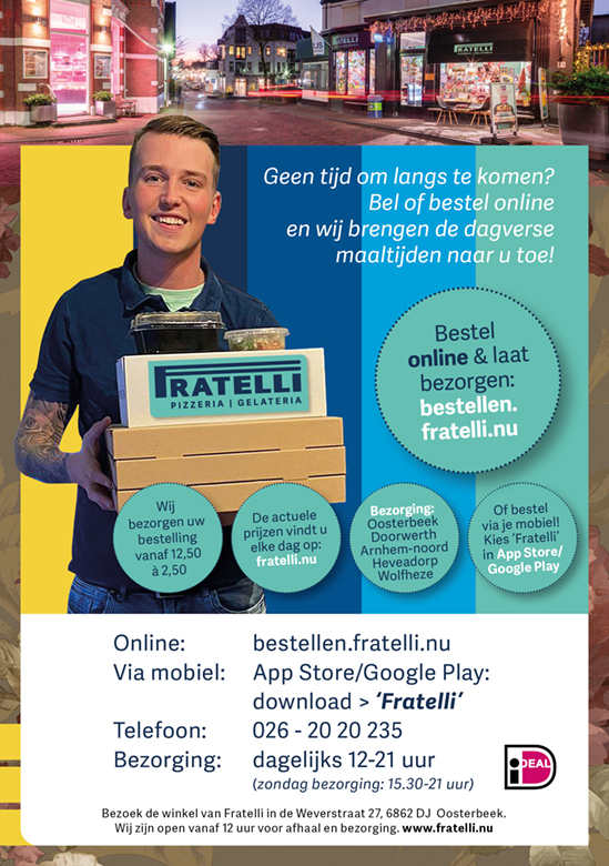 Covid 19 – In 2020 ondersteunde Roverstudio het Italiaans georiënteerde restaurant Fratelli in Oosterbeek gedurende de uitdagende periode van lockdown vanwege de heersende Covid-19 maatregelen met het creëren en produceren van tot actie oproepende A5 flyer die werd verspreid in de hele omgeving van het restaurant. Deze aktie droeg bij aan een verhoogde attentiewaarde voor het restaurant. Fratelli is sinds de opening in 2016 account bij Roverstudio.nl.
